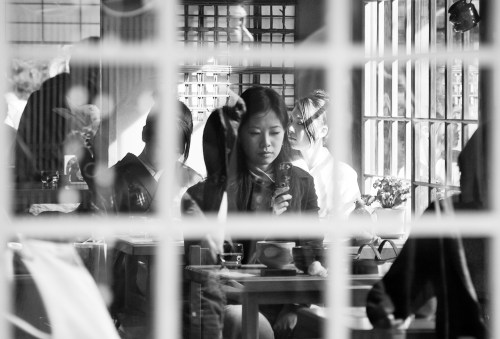 Girl checking her mobile phone as seen through the window of a restaurant in Kyoto